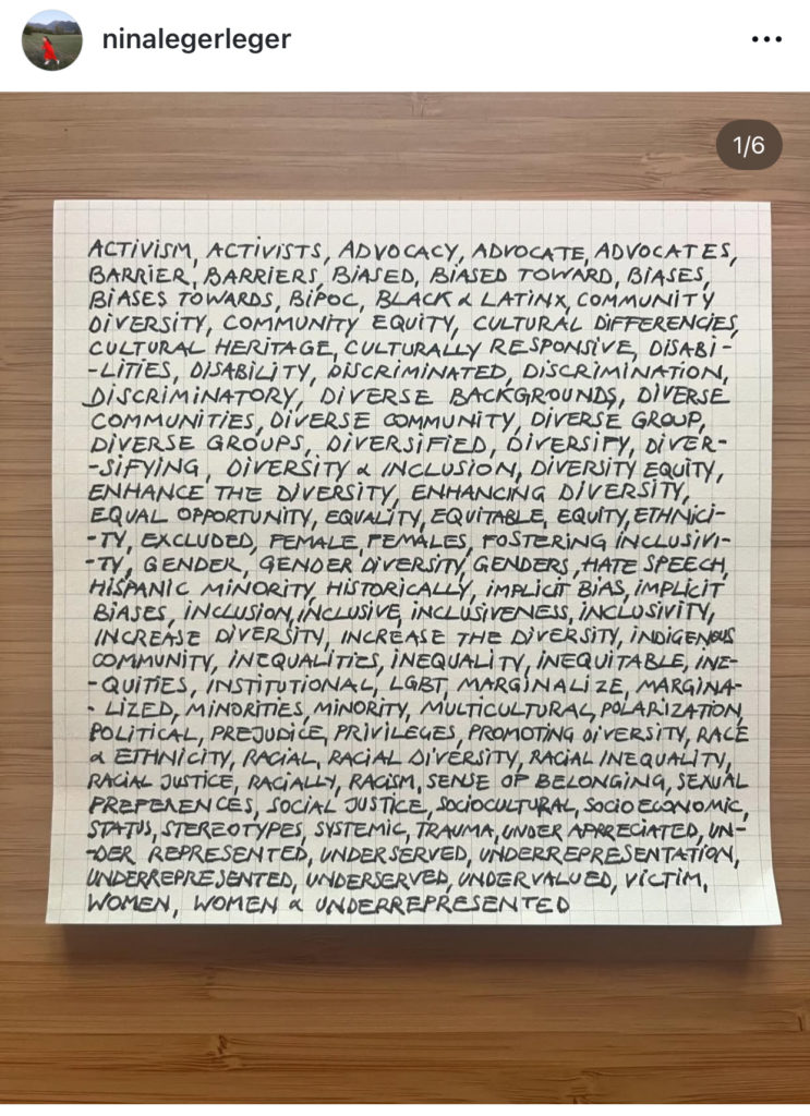 3. C’est, je crois, sur la page Instagram de l’écrivaine Nina Léger que j’ai croisé pour la première fois cette pratique, avant de me rendre compte que plusieurs de mes contacts, de mes ami.e.s, s’y étaient eux-mêmes, ou elles-mêmes, essayé.es, sans s’être concerté.es par avance : le geste consiste à recopier, à la main, l’immense liste des termes retirés par l’administration américaine des documents officiels, bannis par les agences fédérales, et dont l’introduction dans les articles scientifiques peut valoir à leurs auteurs la suppression du financement public de leurs programmes de recherche. En France et dans le monde, de nombreuses personnes se sont ainsi mises à transcrire cette liste de façon manuscrite – “pour ne glisser sur aucun des mots et m’empêcher toute lecture en diagonale”, indique Nina Léger. Je trouve, à vrai dire, que ce geste dénué de toute ambition artistique constitue l’une des performances collectives les plus fortes de ce moment. Pour deux raisons, peut-être.